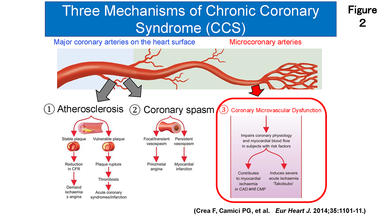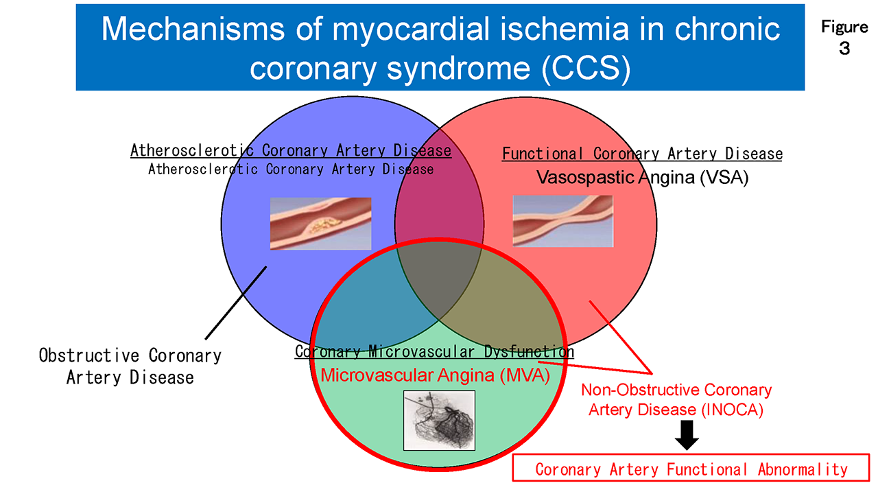 Ischemic heart disease is classified into acute coronary syndrome (ACS) and chronic coronary syndrome (CCS). The mechanisms underlying CCS include: 1) stenosis or occlusion of large coronary arteries, 2) coronary artery spasm, and 3) coronary microvascular dysfunction (see Figures 1 and 2). The latter two are collectively referred to as Ischemia with No Obstructive Coronary Artery Disease (INOCA) (see Figure 3). An important point is that these three mechanisms often coexist in the same patient in varying proportions (see Figure 3). Furthermore, the pathogenesis of coronary microvascular dysfunction involves two mechanisms: increased vasoconstrictive ability and decreased vasodilatory capacity (see Figure 4). Our research has revealed that these two mechanisms also coexist in varying proportions within the same patient (see Figure 5). Importantly, the prognosis is poorest when both large coronary artery abnormalities and microvascular dysfunction are present simultaneously (see Figure 6).