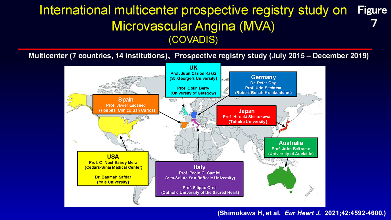 1.Shimokawa H, Suda A, Takahashi J, Berry C, Camici PG, Crea F, Escaned J, Ford T, Yii E, Kaski JC, Kiyooka T, Mehta PK, Ong P, Ozaki Y, Pepine C, Rimoldi O, Safdar B, Sechtem U, Tsujita K, Yasuda S, Beltrame JF, Merz CNB; the Coronary Vasomotor Disorders International Study (COVADIS) Group. Clinical characteristics and prognosis of patients with microvascular angina -An international and prospective cohort study by the Coronary Vasomotor Disorders International Study (COVADIS) Group- Eur Heart J. 2021;42: 4592-4600.