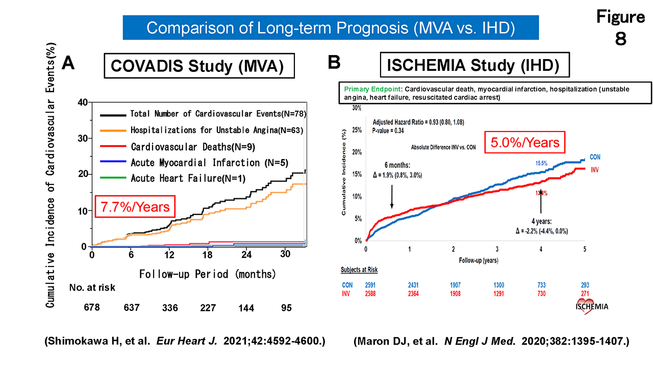 From 2015 to 2019, primarily at COVADIS facilities, a total of 14 facilities across seven countries participated in a multicenter prospective registration study on microvascular angina (MVA), with myself serving as the principal investigator (Figure 7). As a result, it was revealed that patients registered based on COVADIS's strict diagnostic criteria for MVA experienced a significant rate of major cardiovascular events (MACE) at 7.7% per year, predominantly due to unstable angina. Additionally, long-term prognosis analyses, after adjusting for clinical background factors, showed no significant differences based on sex or race, indicating that MVA is an important pathological condition (References 1,10).